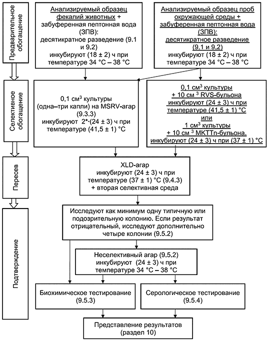Метод обнаружения бактерий рода Salmonella состоит из четырех последовательных этапов (согласно схемам в приложении A).