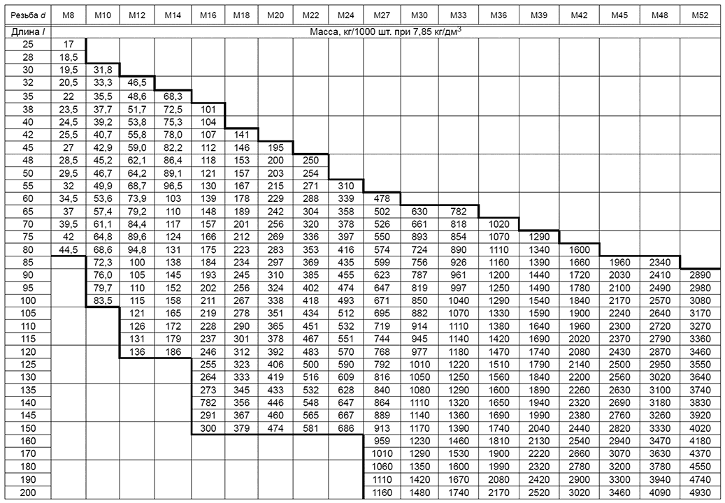 Массы, приведенные в таблице 2, являются справочными для стальных болтов. Такие же массы принимают для болтов с мелкой резьбой.