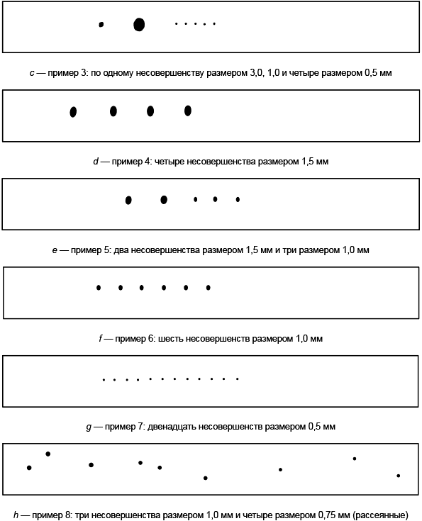 Рисунок А.2 - Примеры распределения несовершенств в виде газовых пор для номинальной толщины стенки труб более 12 мм