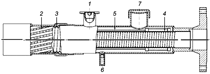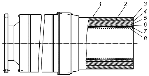 3.1.17 концевая часть: Механическое устройство, образующее переход между телом гибкого трубопровода и присоединительным элементом, различные слои которого оканчиваются в концевом соединении, так что нагрузка передается между гибким трубопроводом и присоединительным элементом.