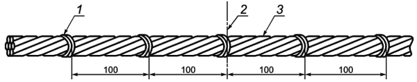 Семь отрезков кабеля в каждом пучке скручивают между собой с шагом скрутки 20-30 D и скрепляют двумя витками проволоки диаметром, приблизительно равным 0,5 мм в центре и на расстоянии через каждые 100 мм по обе стороны от центра (см. рисунок 1).