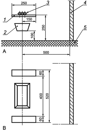 А - вид сбоку; В - вид сверху; 1 - опора; 2 - металлический поддон; 3 - испытуемый образец; 4 - задняя стенка; 5 - пол