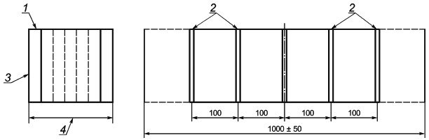 Блок скрепляют двумя витками проволоки диаметром, приблизительно равным 0,5 мм, в центре и через каждые 100 мм по обе стороны от центра (см. рисунок 3). Число испытуемых отрезков, которое требуется для составления плоского блока, должно соответствовать таблице 1; для кабелей наружным диаметром до 5 мм включительно скрепленные испытуемые отрезки не должны формироваться в пучок, и число испытуемых отрезков в плоском горизонтальном блоке рассчитывают в соответствии с формулой