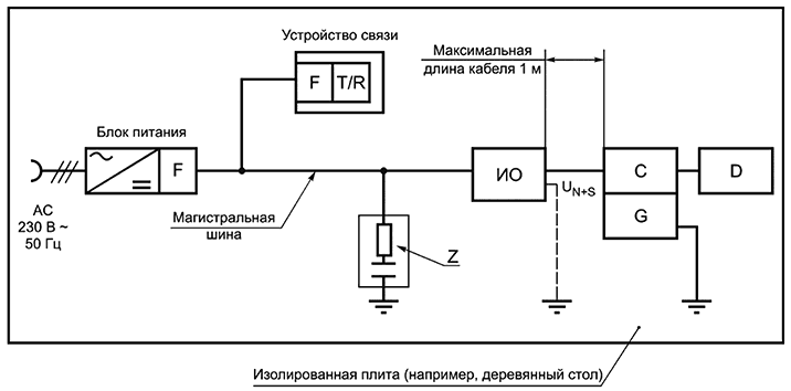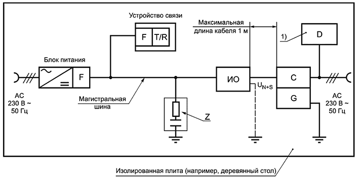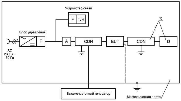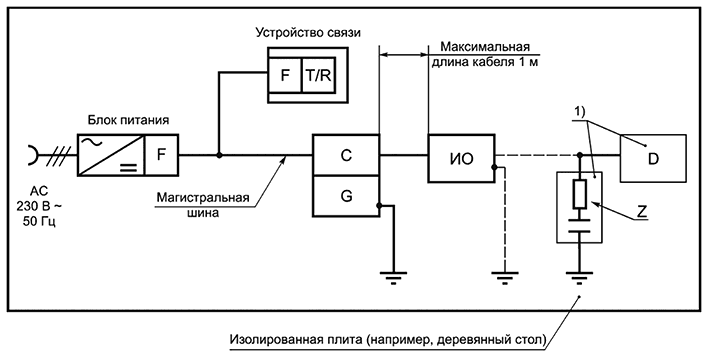 Общие требования к испытанию и испытательная процедура должны соответствовать EN 61000-4-11. Испытательная схема должна соответствовать рисунку СС.18. С точки зрения питания испытание проводится с минимальной конфигурацией и полностью нагруженной шиной.
