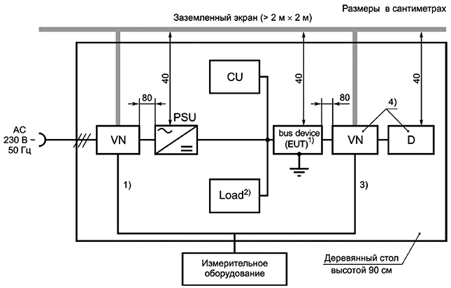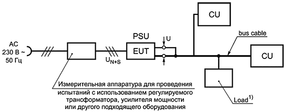 CU - устройство связи; VN - v-эквивалент сети электропитания; PSU - блок питания; EUT - испытуемое оборудование; Bus device - устройство шины; D - устройство, необходимое для функционального испытания оборудования; АС - переменный ток; Load - нагрузка