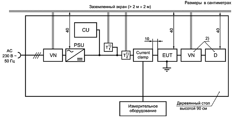 CU - устройство связи; VN - V-эквивалент сети электропитания; PSU - блок питания; Т - оконечное устройство; Current clamp - токопроводящий зажим; EUT - испытуемое оборудование (ИО); D - устройство, необходимое для функционального испытания оборудования; АС - переменный ток.