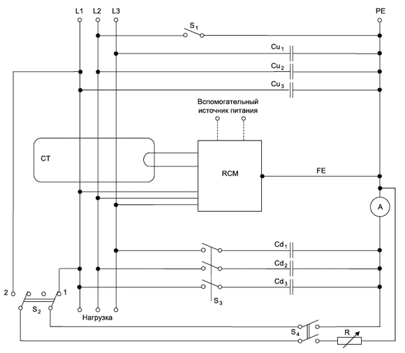 3.3.1 устройство контроля дифференциального тока; RCM (residual current monitor): Устройство или группа устройств, которые контролирует дифференциальный ток в электрической установке и включает предупредительную сигнализацию, когда дифференциальный ток превышает значение срабатывания устройства.
