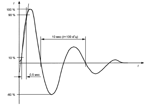 3.1.3 пульсирующий постоянный ток (pulsating direct current): Ток в форме пульсирующей волны, принимает за каждый период пульсаций, следующих периодически с номинальной частотой, нулевое значение или значение, не превышающее 0,006 А постоянного тока, в течение одного непрерывного промежутка времени, выраженного в угловых величинах не менее 150°.