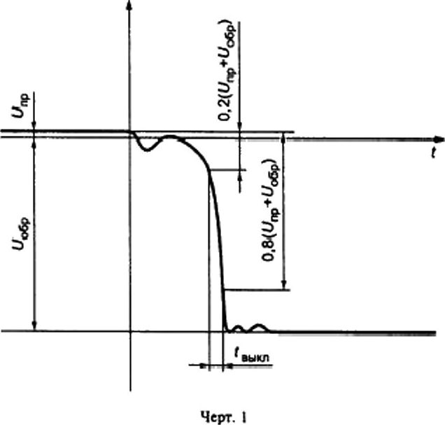 1.1. Измерение времени выключения г^^ проводят в режиме переключения диода из открытого состояния в закрытое. Переходный процесс выключения диода регистрируют измерительным устройством. Вид осциллограммы, характеризующей процесс переключения, показан на черт. 1.