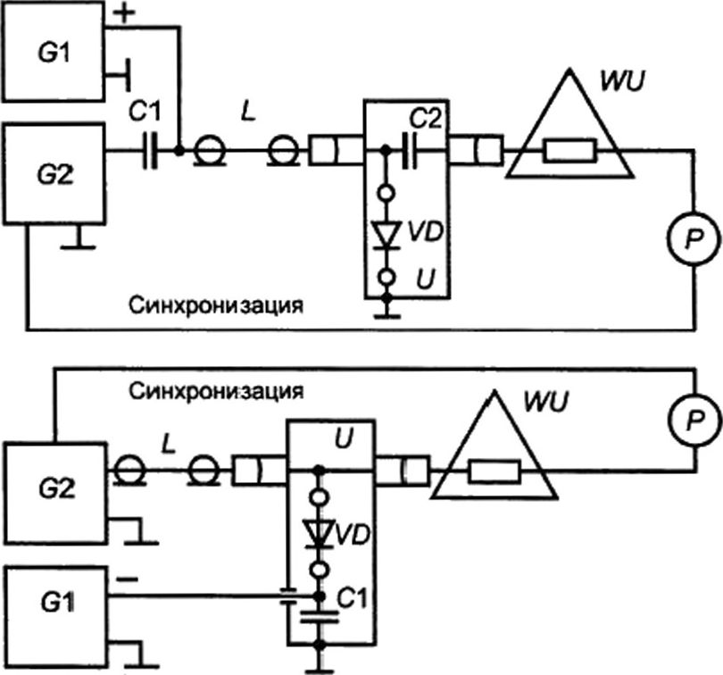 (71 — генератор прямого тока; <72 — генератор импульса обратного напряжения; U — измерительный адаптер; CI и □-разделительные конденсаторы; WU - аттенюатор; Р — измерительное устройство, L — развязывающий коаксиальный кабель, VD - измеряемый диод
