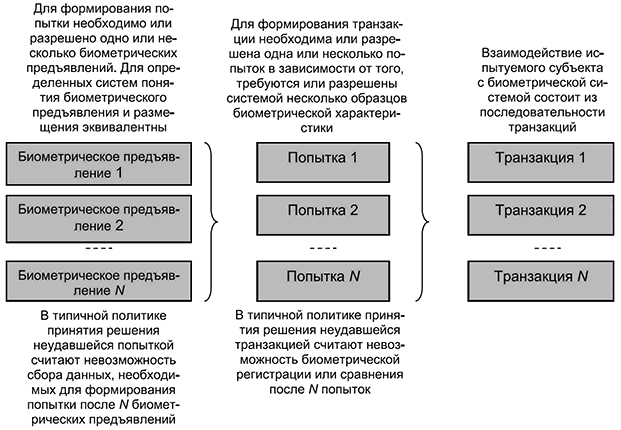3.10 транзакция идентификации (identification transaction): Последовательность из одной или нескольких попыток сбора биометрических данных и биометрического поиска соответствующего контрольного шаблона, который может относиться к данному испытуемому субъекту.