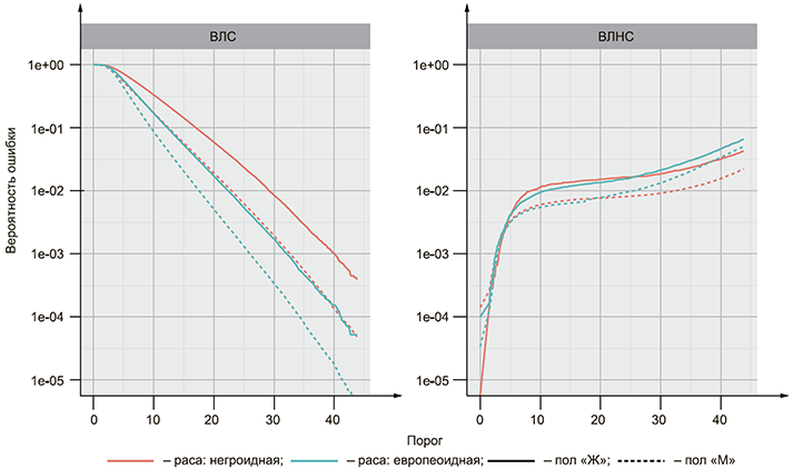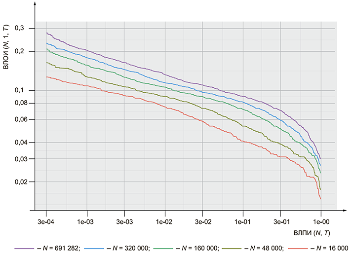 1 ВЛПИ может быть выражена как функция от числа зарегистрированных в системе испытуемых субъектов N, а также от порога принятия решения T, которому должны удовлетворять возвращаемые идентификаторы.