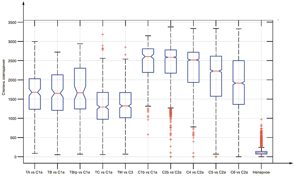 Определение ранга биометрической идентификации для каждой попытки парного сравнения (i) проводят следующим образом: