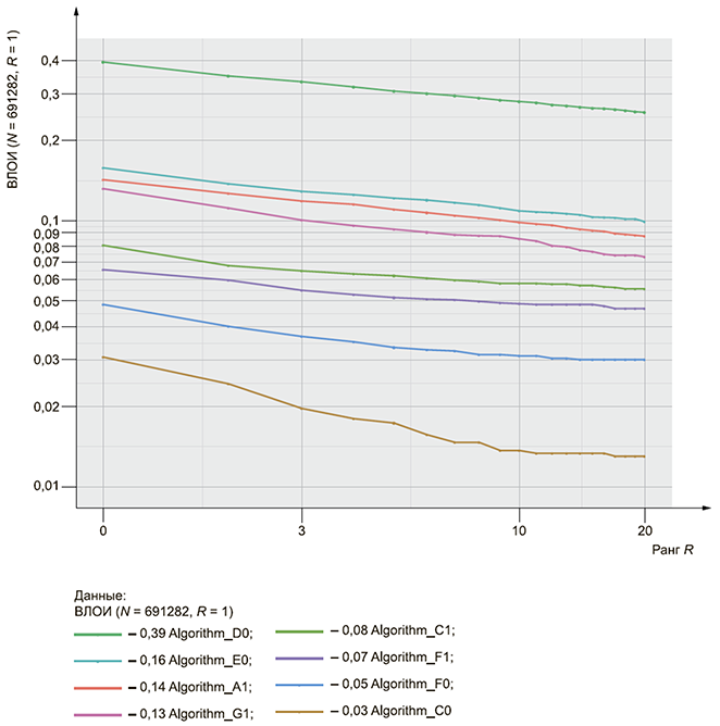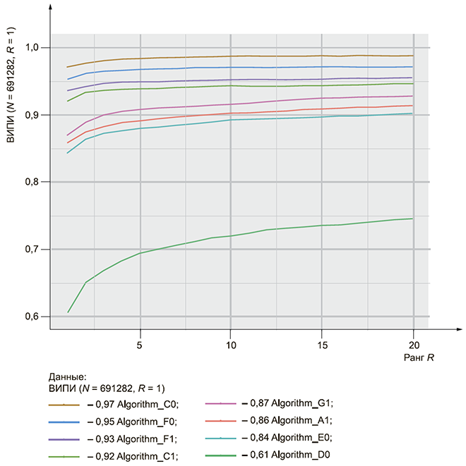 Алгоритм эффективного получения данных для графика ХСС [ранг R, ВИПИ (N, R, 0)] имеет следующий вид (при предположении, что каждому испытуемому субъекту соответствует один биометрический контрольный шаблон и возможен случай, когда результат парного сравнения равен результату непарного сравнения).