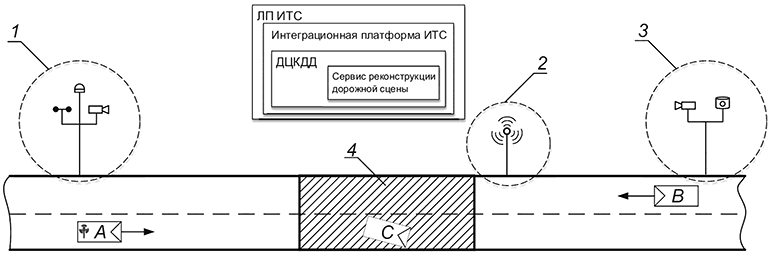 A - ВАТС; B - динамический объект; C - динамический объект на пути следования ВАТС; 1 - инфраструктура ИТС; 2 - инфраструктура К-ИТС; 3 - элементы высокоточного детектирования ДЦКДД; 4 - АОУ