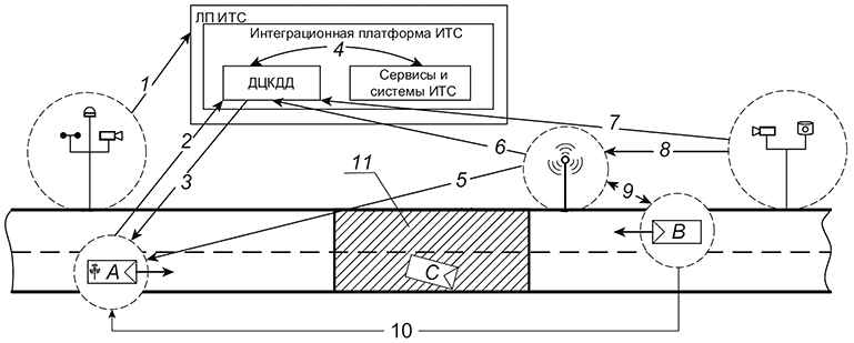 6.1.3 Инфраструктура ИТС должна осуществлять сбор общей информации о метеоусловиях, состоянии поверхности дорожного покрытия, дорожной обстановке, информации об инцидентах и информации, получаемой от АСУДД в целом по сети дорог, на которую распространен ЛП ИТС.