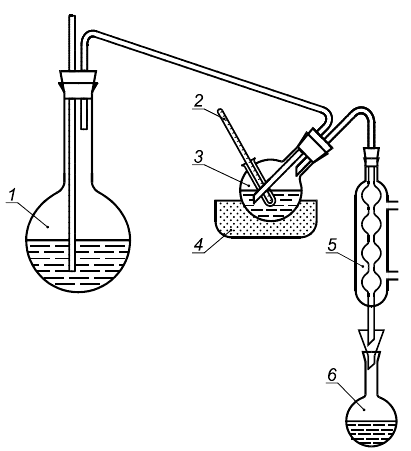 1 - парообразователь - колба К-1-1000(2000)-29/32 (34/35, 45/40) ТС по ГОСТ 25336; 2 - термометр для измерения температуры до 150°С с минимальной ценой деления 1°С; 3 - реакционная круглодонная короткогорлая колба вместимостью 250 см из термостойкого стекла или кварца с карманом для термометра; 4 - колбонагреватель, соединенный с реле; 5 - шариковый холодильник; 6 - приемник для конденсата - колба мерная 2(2а)-250-2 по ГОСТ 1770