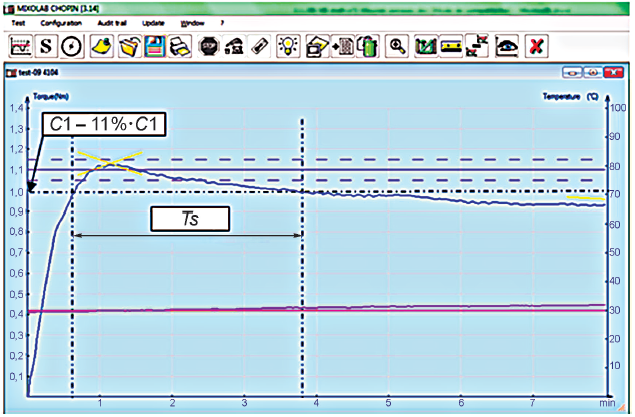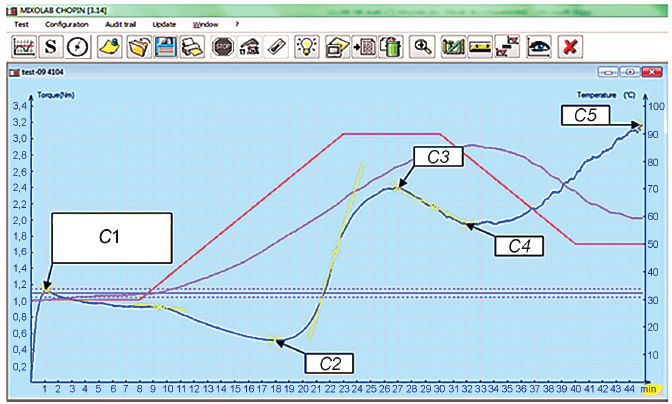 При помощи прибора "Миксолаб" измеряют момент силы между двумя лопастями тестомесилки во время замеса, изменяя температуру внутри чаши, что позволяет получить подробную информацию о пробах, характеризующих анализируемую пшеницу или муку.