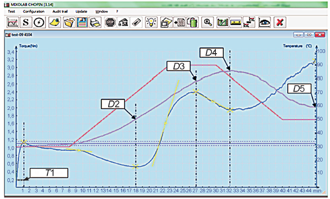 Значение момента силы теста, а также температуру записывают в течение всего процесса испытания. Результаты испытаний характеризуют качество клейковины, клейстеризацию и ретроградацию крахмала, ферментную активность и все взаимодействия, происходящие между компонентами теста в течение замеса.