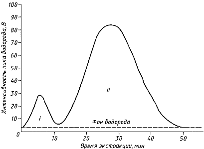 5.4.17 Экстракцию считают законченной при достижении значения интенсивности выделения водорода, равного значению фона или превышающего это значение на 10-15% (рисунок 5). Удаление образца из зоны нагрева - по 5.4.14.