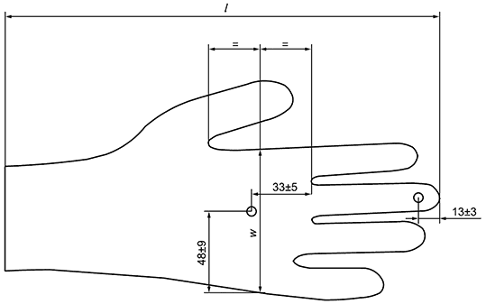 При измерении в точках, показанных на рисунке 1, перчатки должны соответствовать размерам по ширине и длине ладони, указанным в таблице 2, при уровне контроля и приемлемом уровне качества (AQL), указанным в таблице 1.