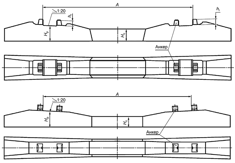 анкер: Металлическая деталь, забетонированная в теле шпалы и выступающая над поверхностью, предназначенная для крепления рельса клеммами рельсового скрепления. [ГОСТ 33320-2015, пункт 3.1] |