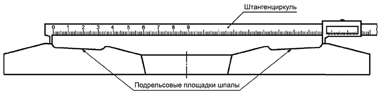 7.6 Глубину выкружки c в шпалах типа III измеряют штангенциркулем типа Г по ГОСТ 166-89 (пункт 1.1) от уровня подрельсовой площадки по схеме, приведенной на рисунке 12.