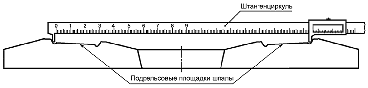 7.4.3 В шпалах типа II ножки штангенциркуля должны касаться внутренних плоскостей наружных головок анкеров на противоположных концах шпалы на уровне выхода головок из бетона [см. рисунок 8 в].