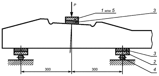 1 - стальная пластина толщиной не менее 25 мм, с уклоном нижнего основания 1:20; 2 - стальная пластина; 3 - упругая прокладка: деревянная толщиной не менее 25 мм или резиновая толщиной не менее 10 мм; 4 - стальная опора; 5 - стальная пластина толщиной не менее 75 мм (для шпал типа II)
